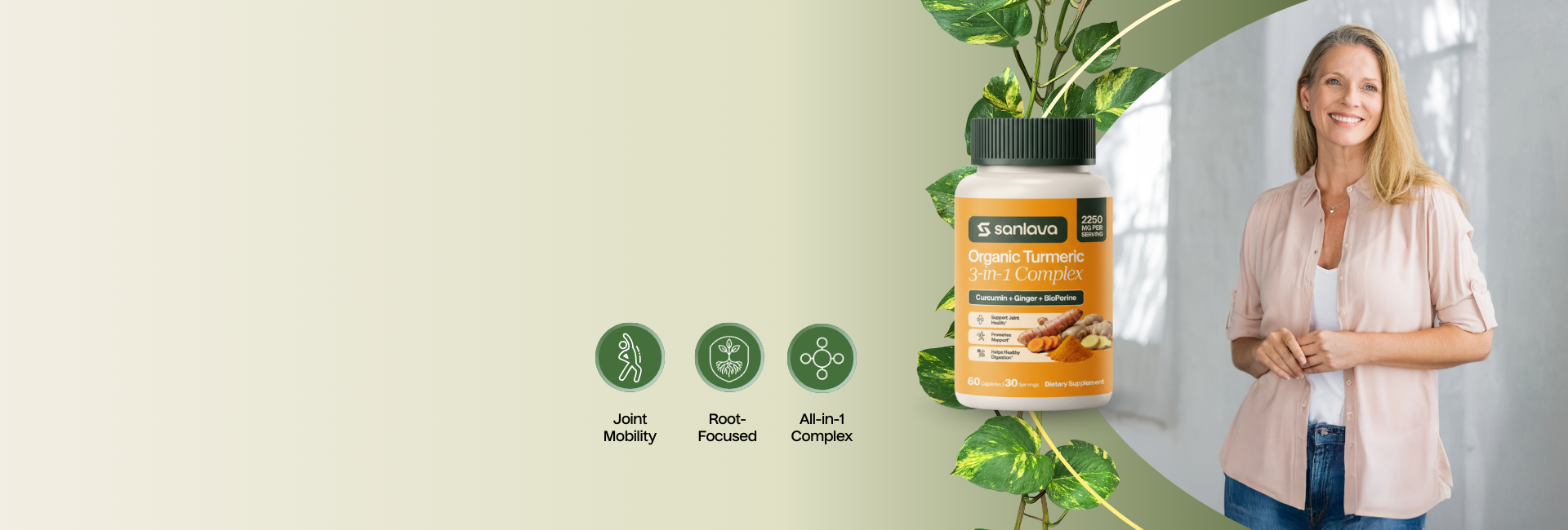 Sanlava Turmeric Organic 3-in-1 Complex helps ease stiffness, support smooth movement, and restore natural energy. To feel active and independent every day.